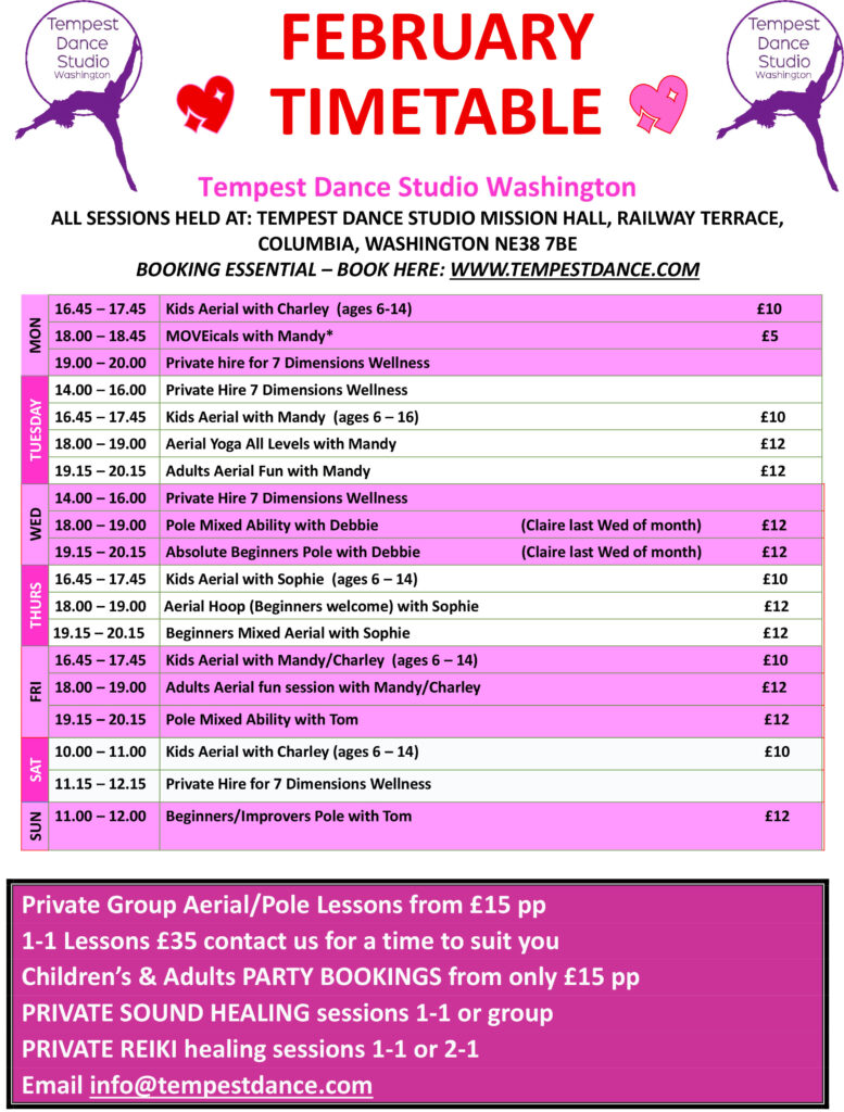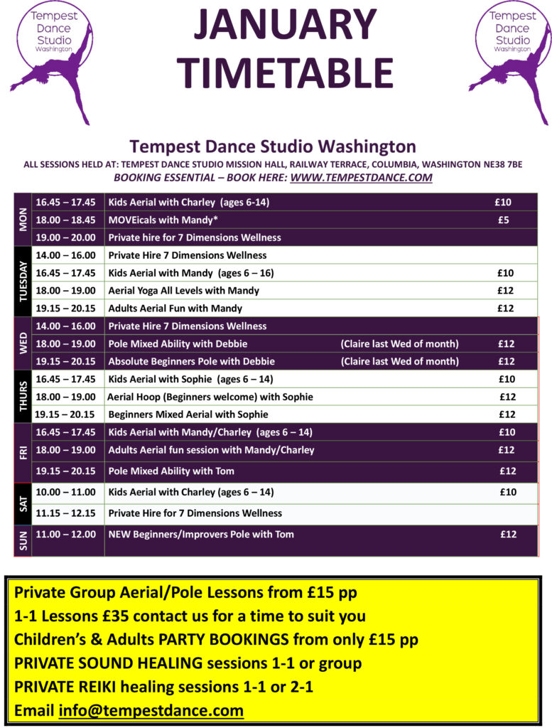 All the classes shown below are at the Washington studio, Mission Hall, Railway Terrace, NE38 7BE.