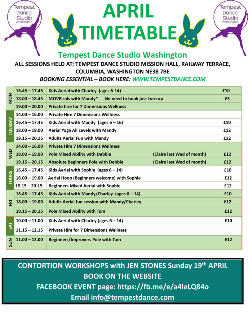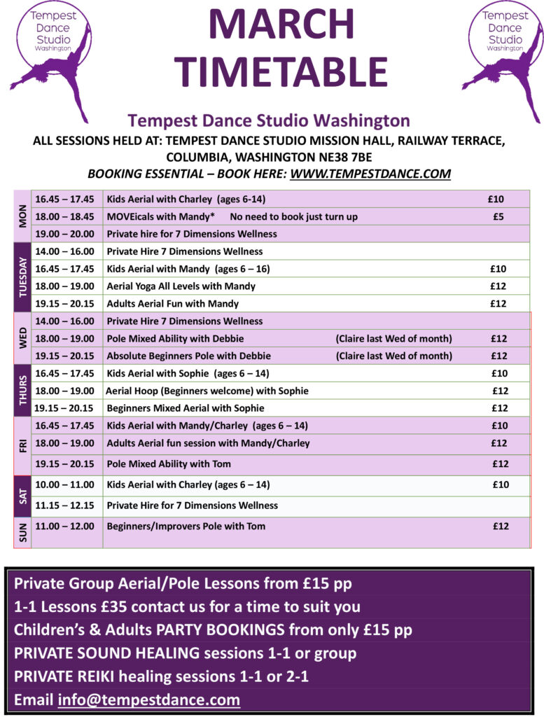 All the classes shown below are at the Washington studio, Mission Hall, Railway Terrace, NE38 7BE.